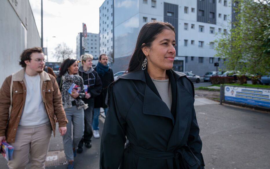 La candidate LFI Lahouaria Addouche en campagne devant une école du quartier populaire de Lille-Sud, forte de ses 23,36% au premier tour. Face à elle, PS et Ecologistes ont décidé de faire alliance. LP/Sarah Alcalay